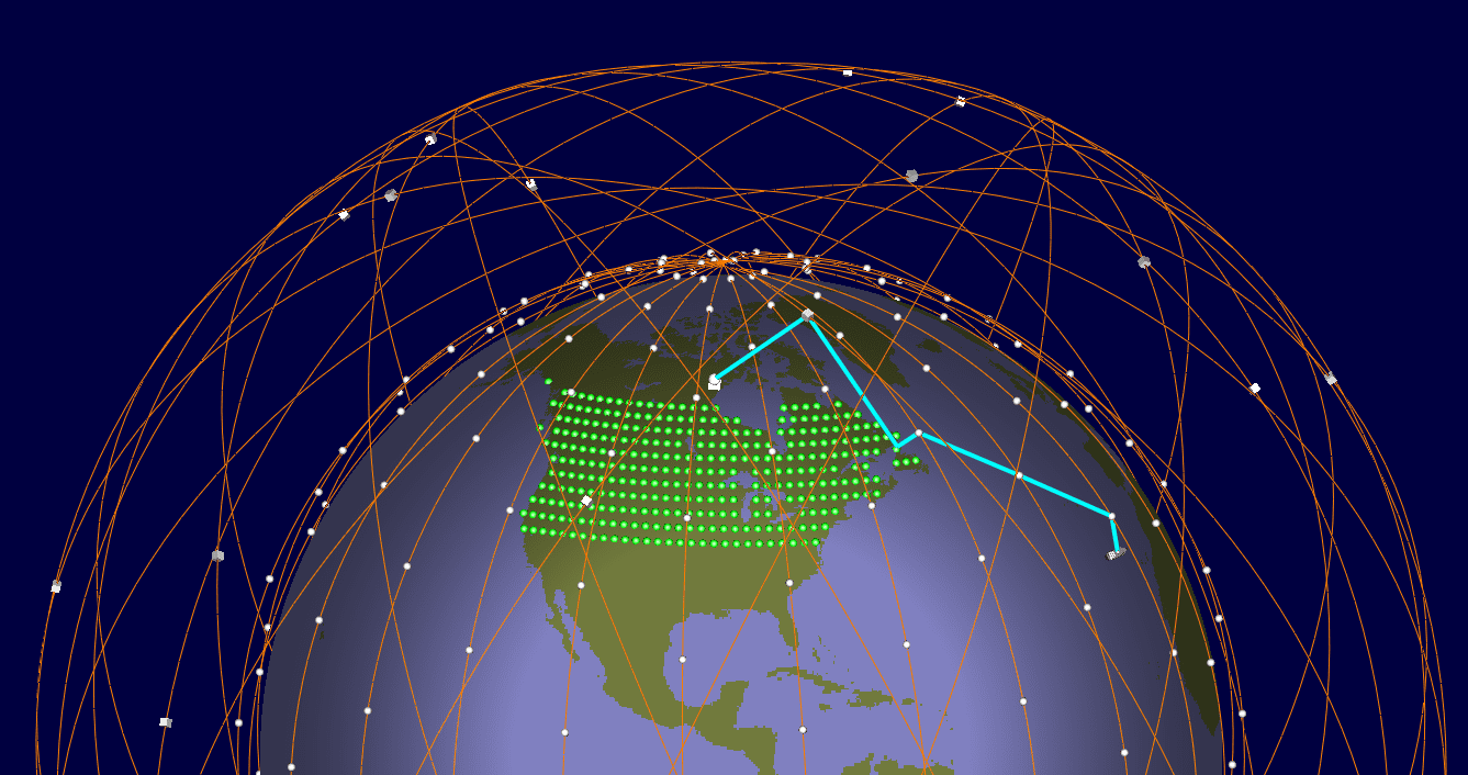 - Ground relays were evenly distributed within North America, covering latitudes between 25°N and 60°N. Two ground stations (user terminals) were placed near the northwest and southeast corners of the area.